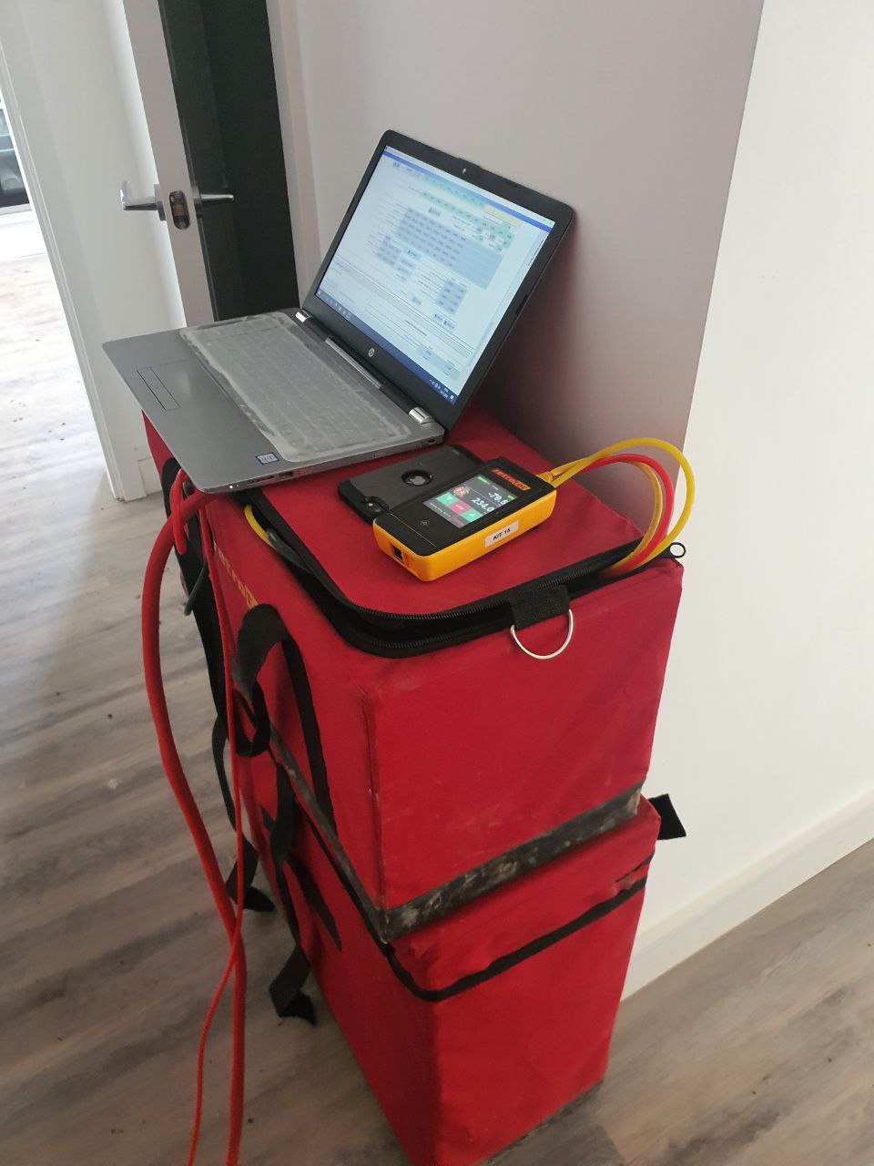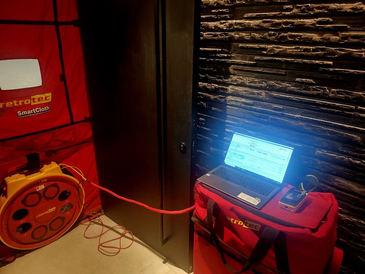 Before testing, we ensure the building is properly prepared by sealing all service penetrations, checking that windows, doors, and vents are installed and closed, and confirming that plumbing and electrical work is complete. A blower door system is then set up to pressurise or depressurise the building, allowing us to measure air leakage and identify problem areas using smoke tests and thermal imaging.
